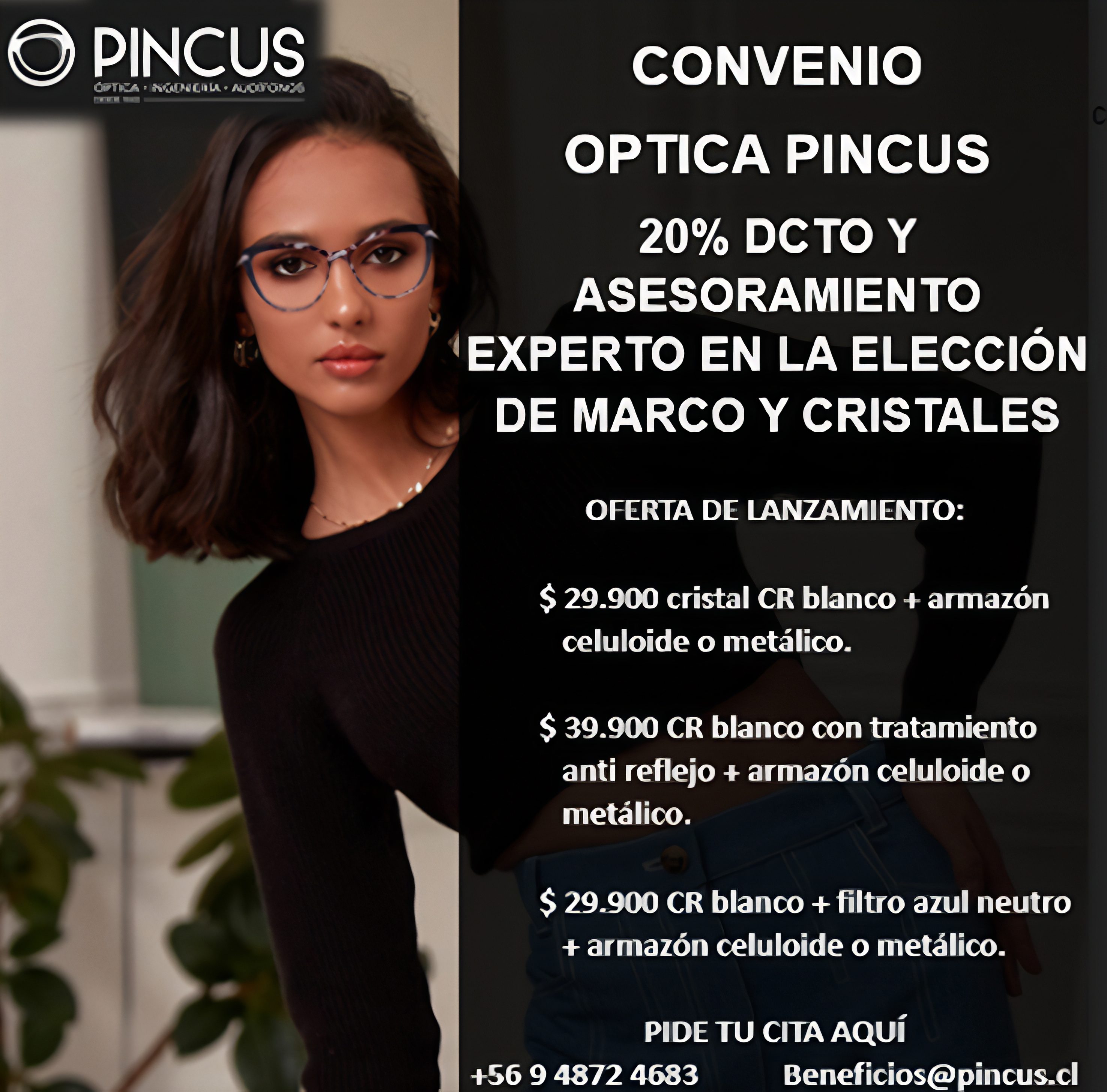 Compra de Lentes Ópticos, (Armazones y Cristales), Lentes de Contacto, Audífonos, Lentes de Sol, Instrumentos, Prismáticos, Telescopios, Microscopios, Barómetros, y reparaciones con un 20% DE DESCUENTO en pago contado, tanto para asociadas y asociados, como a sus cargas familiares.